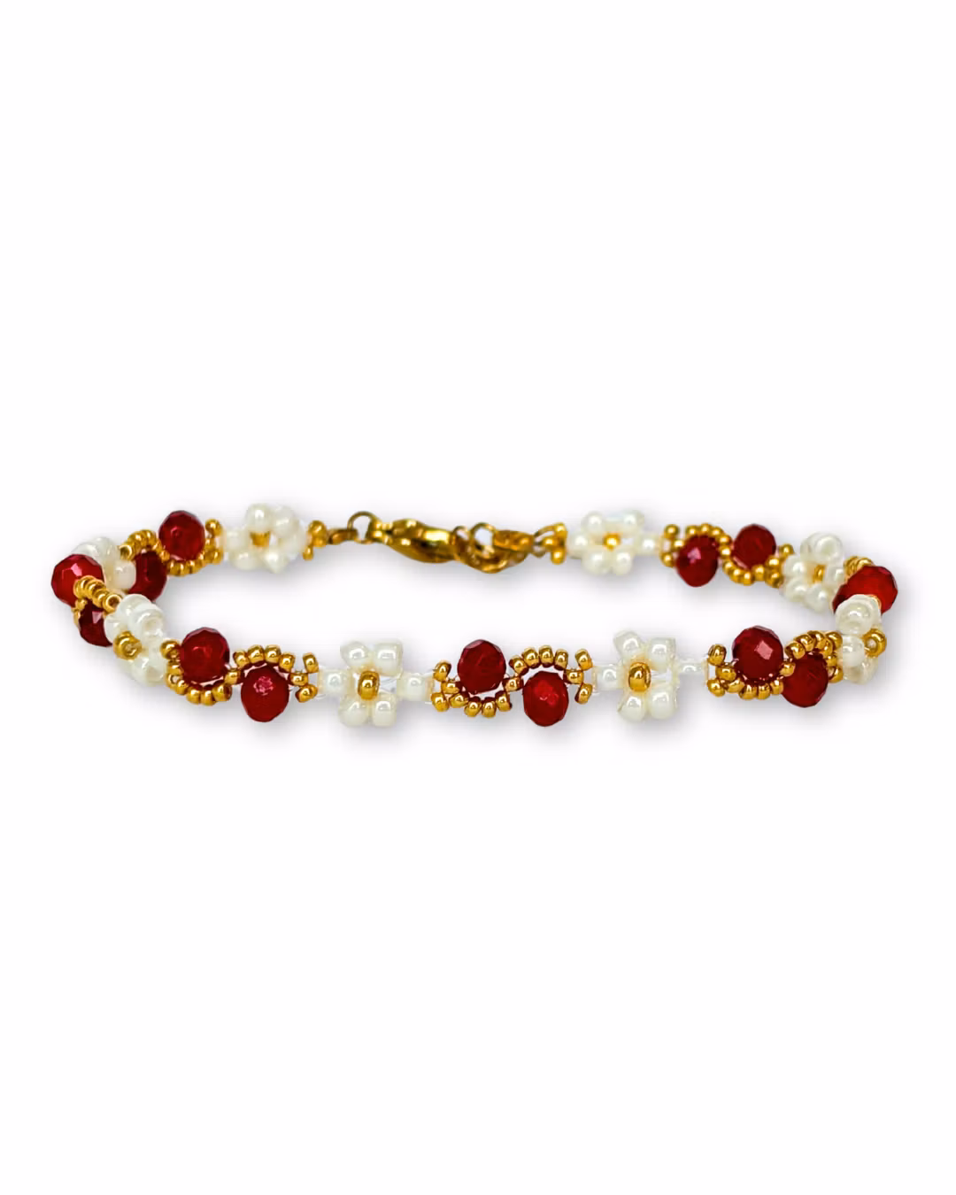RØD SWIRL armbåndet er inspirert av delikate blomster, med elegante detaljer i gull, kombinert med glitrende fasettperler i rød. Armbåndet er håndlaget med Miyuki sine høykvalitets glassperler, og har en justerbar passform som gjør det behagelig å bruke hver dag.